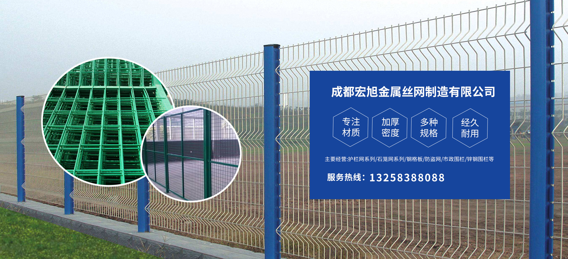 成都宏旭金属丝网制造有限公司主营护栏网系列、石笼网系列、钢格板、防盗网、市政围栏、锌钢围栏、钢筋网片、声屏障系列、波形护栏板、柔性缆索护栏、SNS边坡防护网等其他丝网类产品。特殊规格可加工定做,也可根据客户来图来样定做。自创业以来,公司一直坚持市场为导向,以客户为根本,以实业为基础,以技术为支持,以科研为后盾,集科研、生产、经营为一体,不断研制开发新产品,开拓市场,走综合发展之路。多年来,公司凭借过硬的质量,良好的信誉、优质的服务、合理的价格,赢得了市场和商家的一致好评。